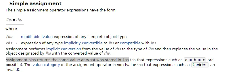 这才发现,原来是有返回值的,而且返回值是等号左边的变量的值。 于是我便敲了一个程序来验证,运行结果果然和C reference中的描述的一样